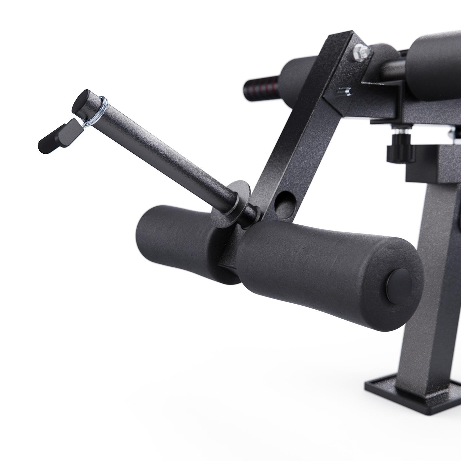 Скамья спортивная оснащена 11 уровнями наклона спинки и 3 положениями сиденья, что позволяет выполнять разнообразные упражнения для проработки всех групп мышц. Оптимальная высота сиденья 43 см делает тренировки комфортными для людей любого роста. В комплекте также идут 4 мягких валика из вспененного материала для фиксации ног в разных положениях. Длина посадочного места под диски 18,5 см, посадочный диаметр для дисков равен 25 мм. В комплекте идёт пружинный замок для дисков.