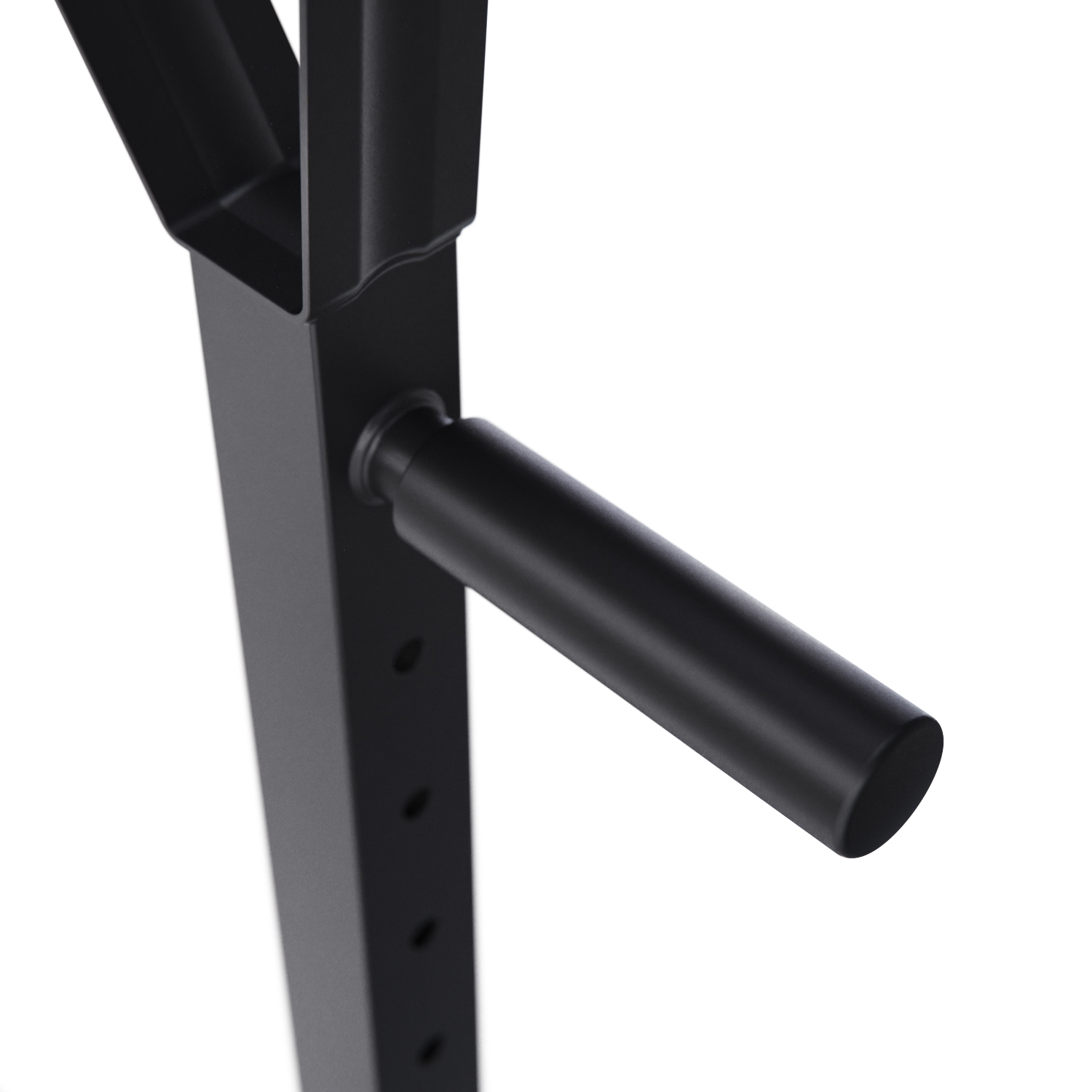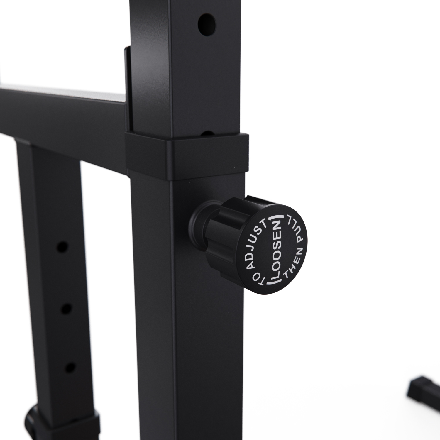 Высота держателей под штангу легко регулируется без дополнительных инструментов при помощи ручки. Держатели под штангу регулируются по высоте на 11 уровней большая в диапазоне от 102 до 162 см и на 5 уровней меньшая в диапазоне от 64 до 88 см.