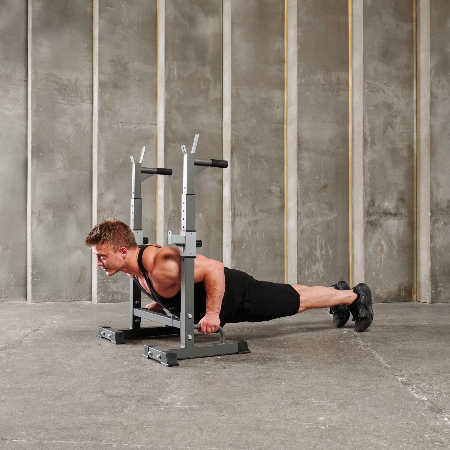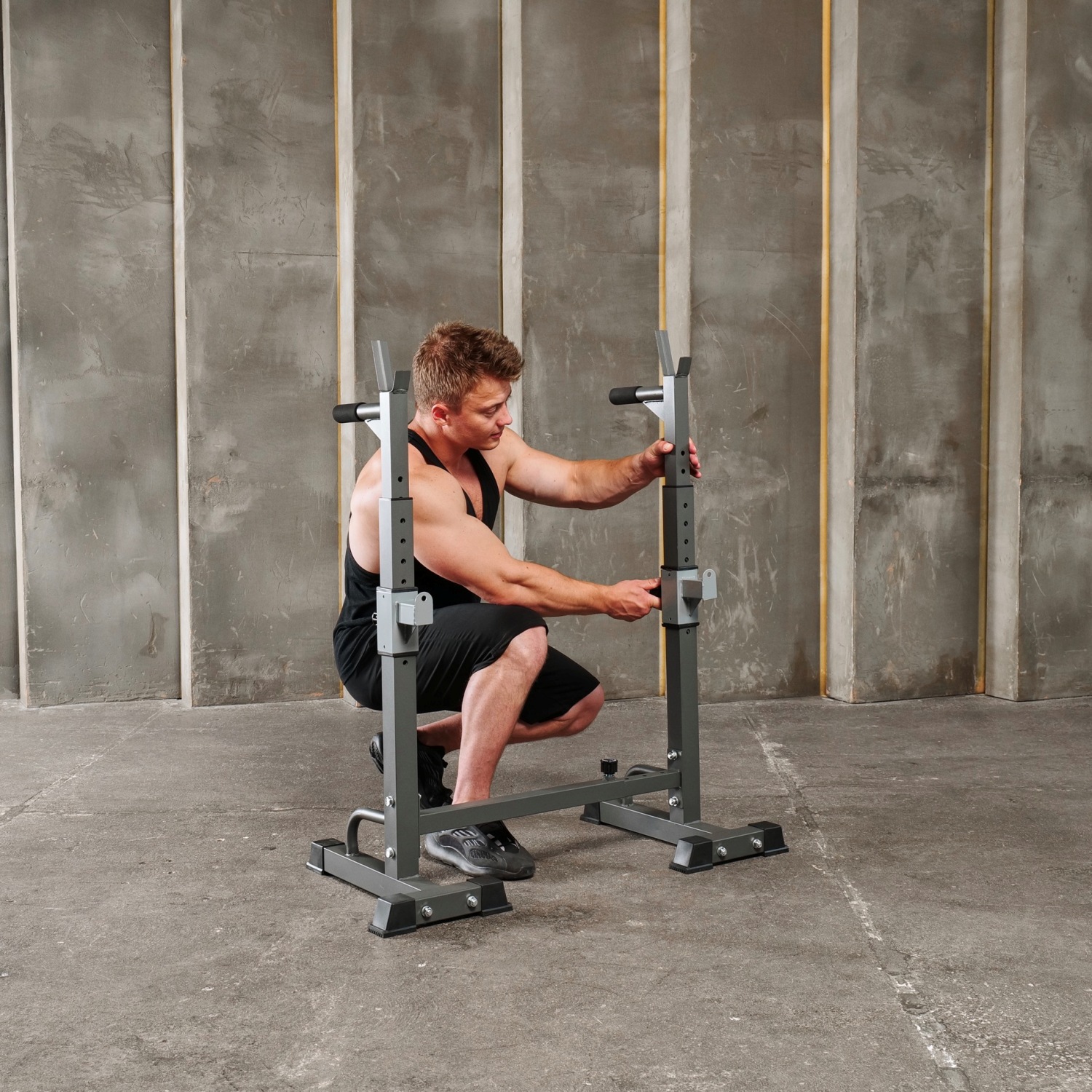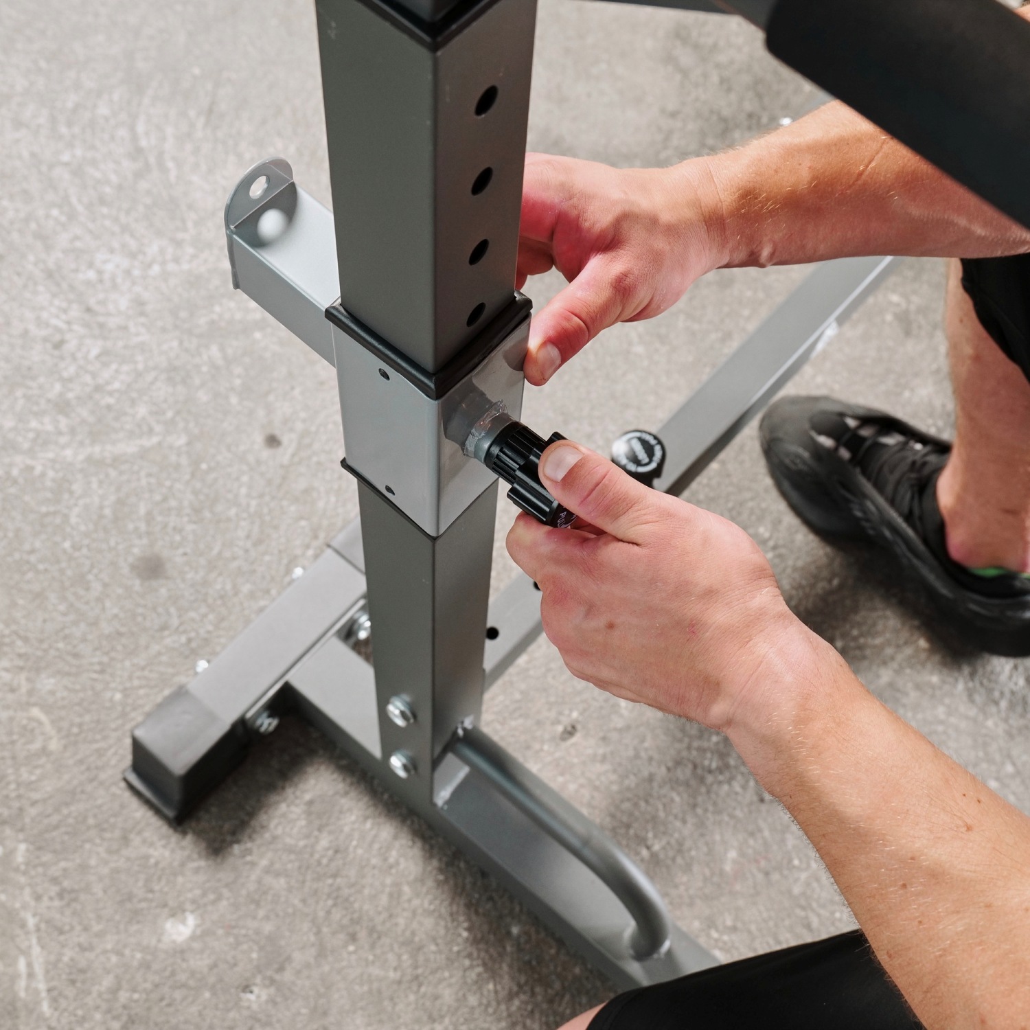 Высота брусьев и ширина стойки легко регулируется без дополнительных инструментов. 12 уровней на верхних ручках и 8 уровней - на нижних. Внутренняя ширина регулируется в диапазоне от 54 до 99 см.