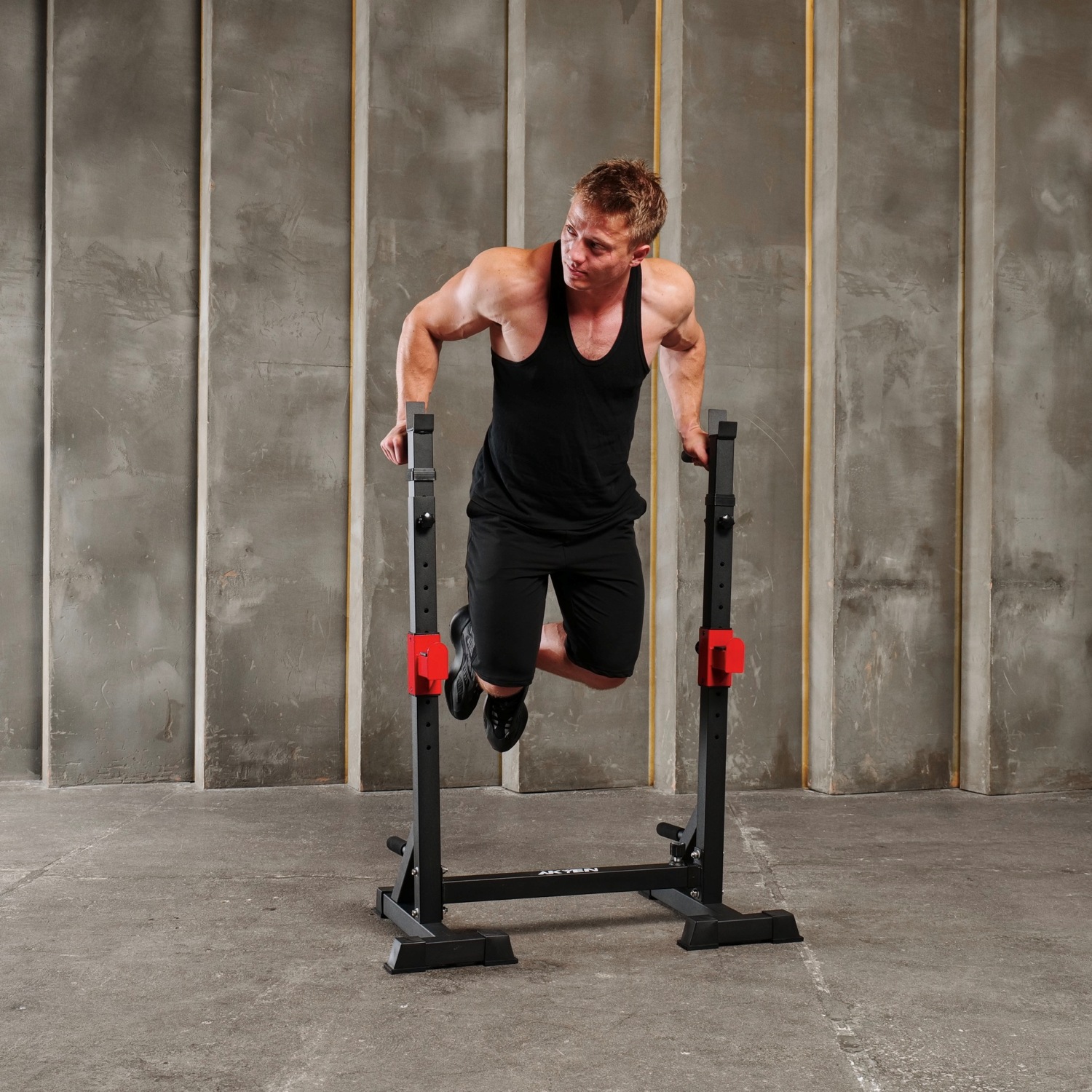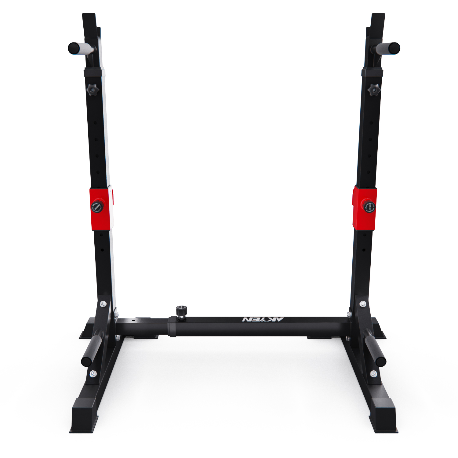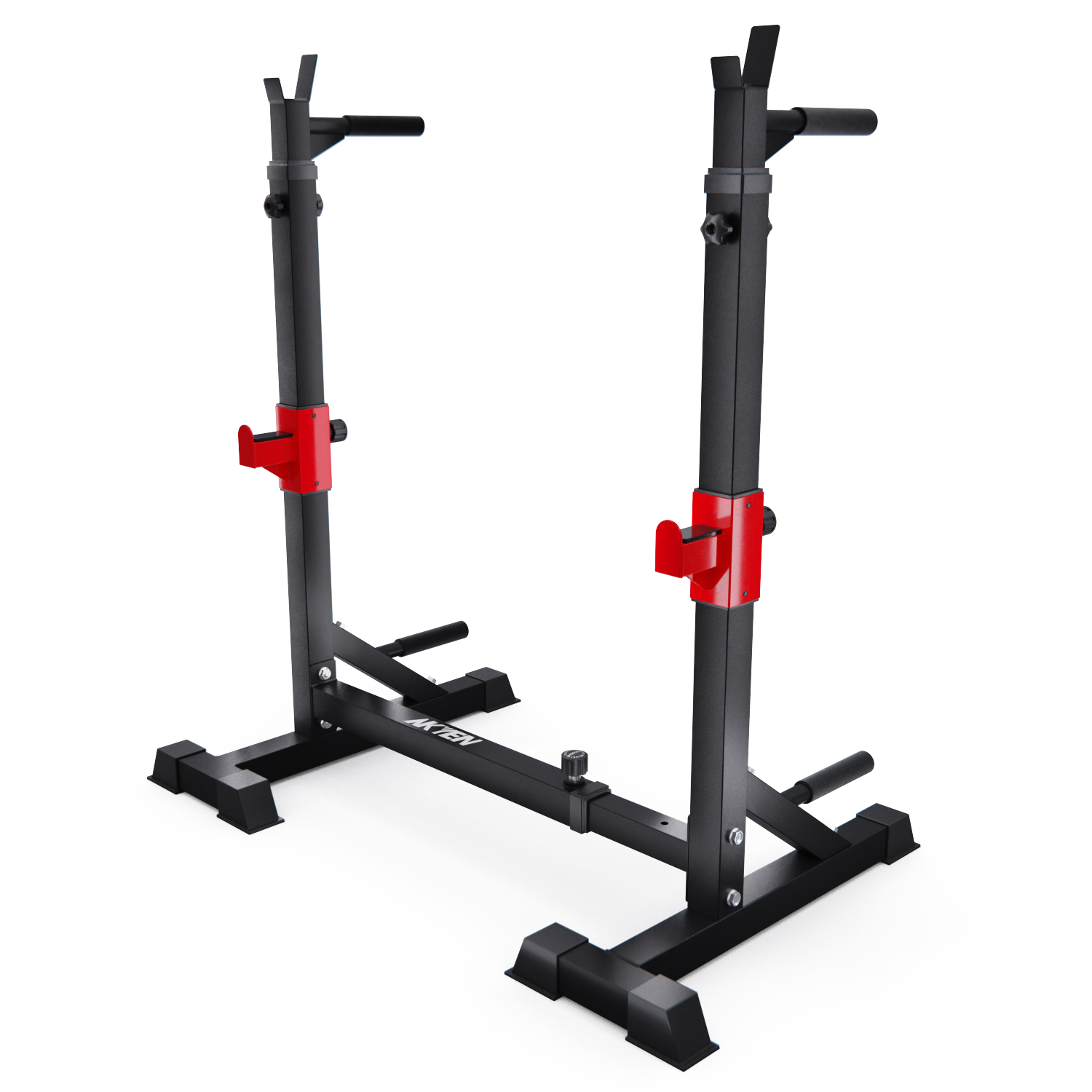 Стойка под штангу с брусьями DFC AKYEN J07 для домашнего использования. Шаг регулировки высоты 5 см, а регулировки ширины – 16,5 см. Регулируемая стойка для приседаний AKYEN 3-в-1.