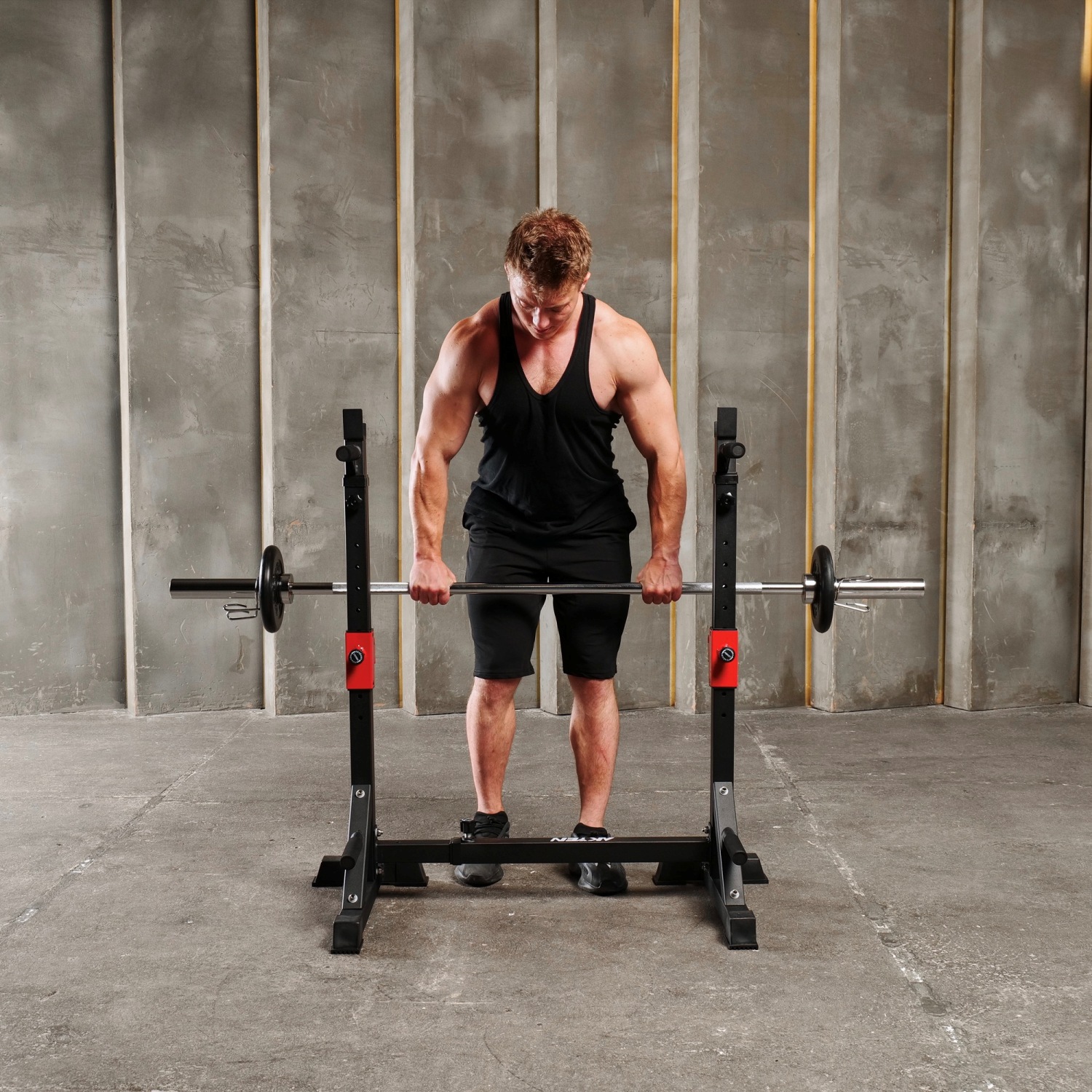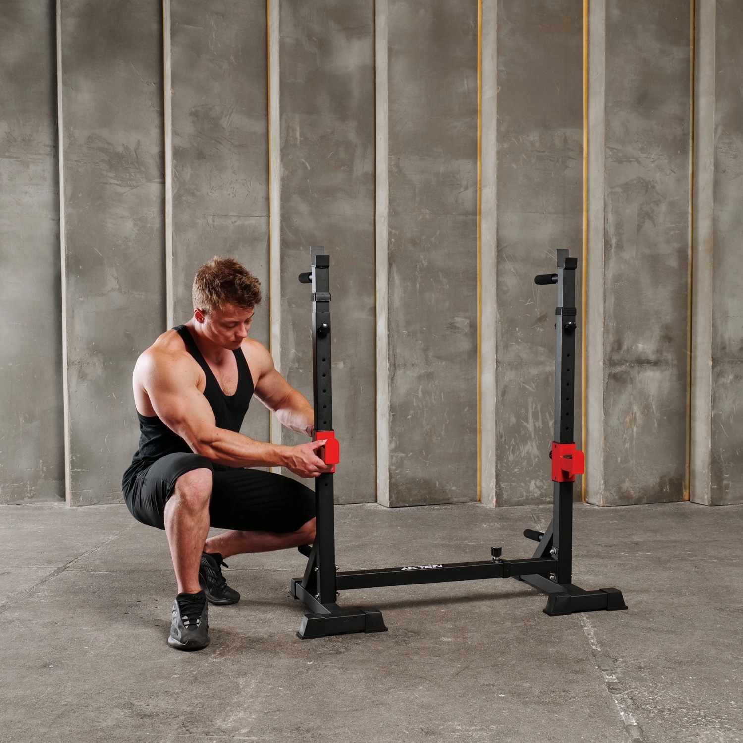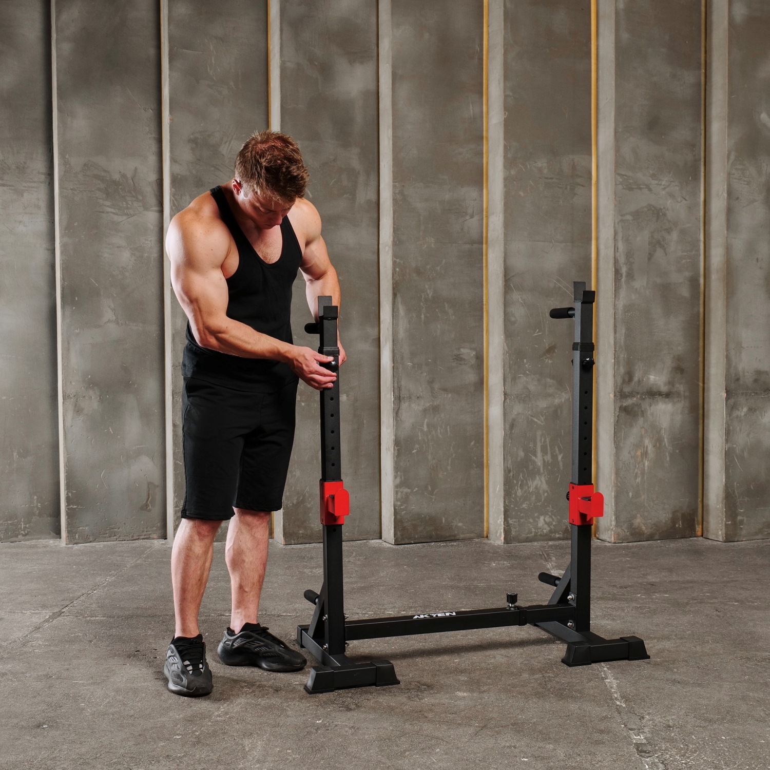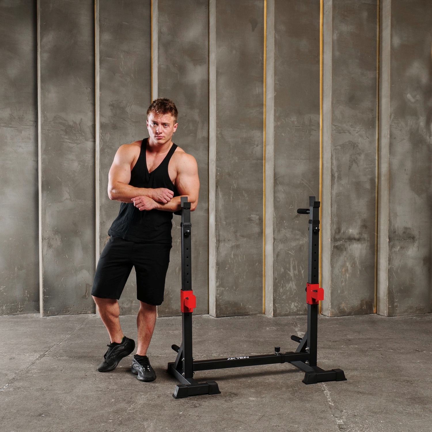 Стойка под штангу с брусьями DFC AKYEN J07 для домашнего использования. Шаг регулировки высоты 5 см, а регулировки ширины – 16,5 см. Регулируемая стойка для приседаний AKYEN 3-в-1.