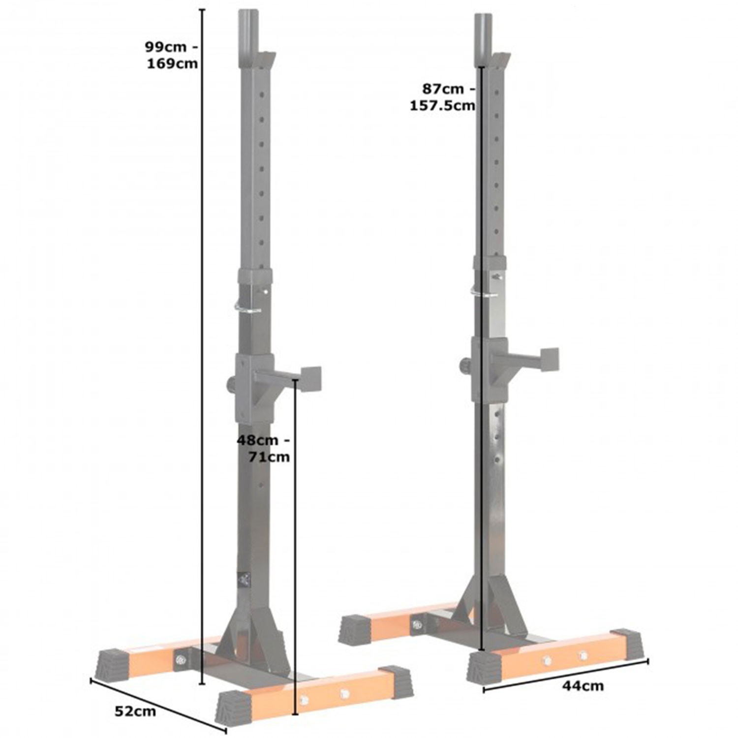 Держатели под штангу регулируются по высоте в диапазоне от 87 до 157,5 см. 15 уровней с шагом 5 см.