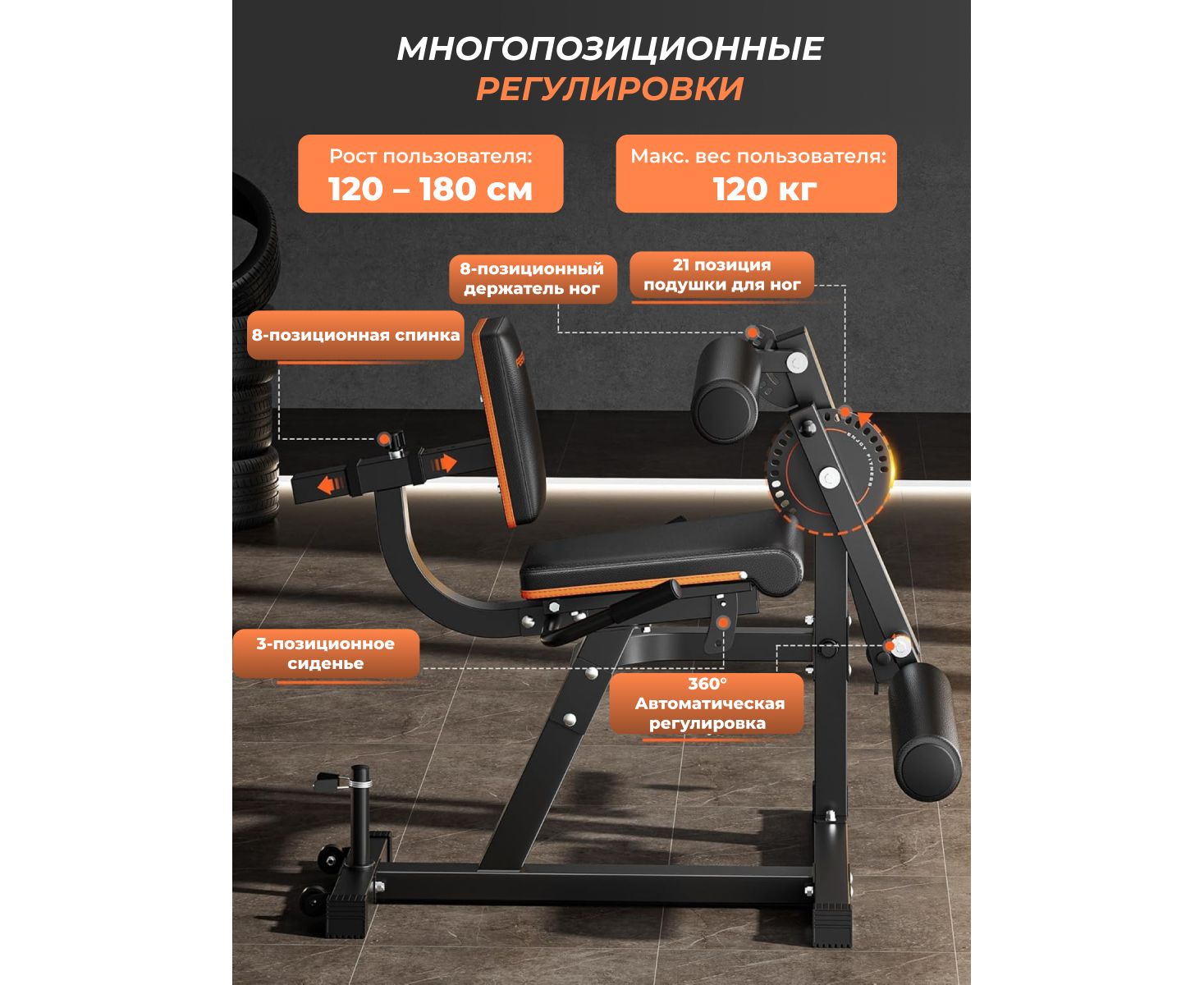 Максимальный вес пользователя составляет до 120 кг, что обеспечивает безопасную и комфортную эксплуатацию тренажёра для людей разного уровня подготовки. Спинка регулируется в 8 положениях, а сиденье — в 3 режимах. Индивидуальная настройка тренажера обеспечивает максимальный комфорт и эффективность. Большой диск для регулировки угла наклона руки и ноги имеет 21 уровень, а меньший диск на 8 уровней.