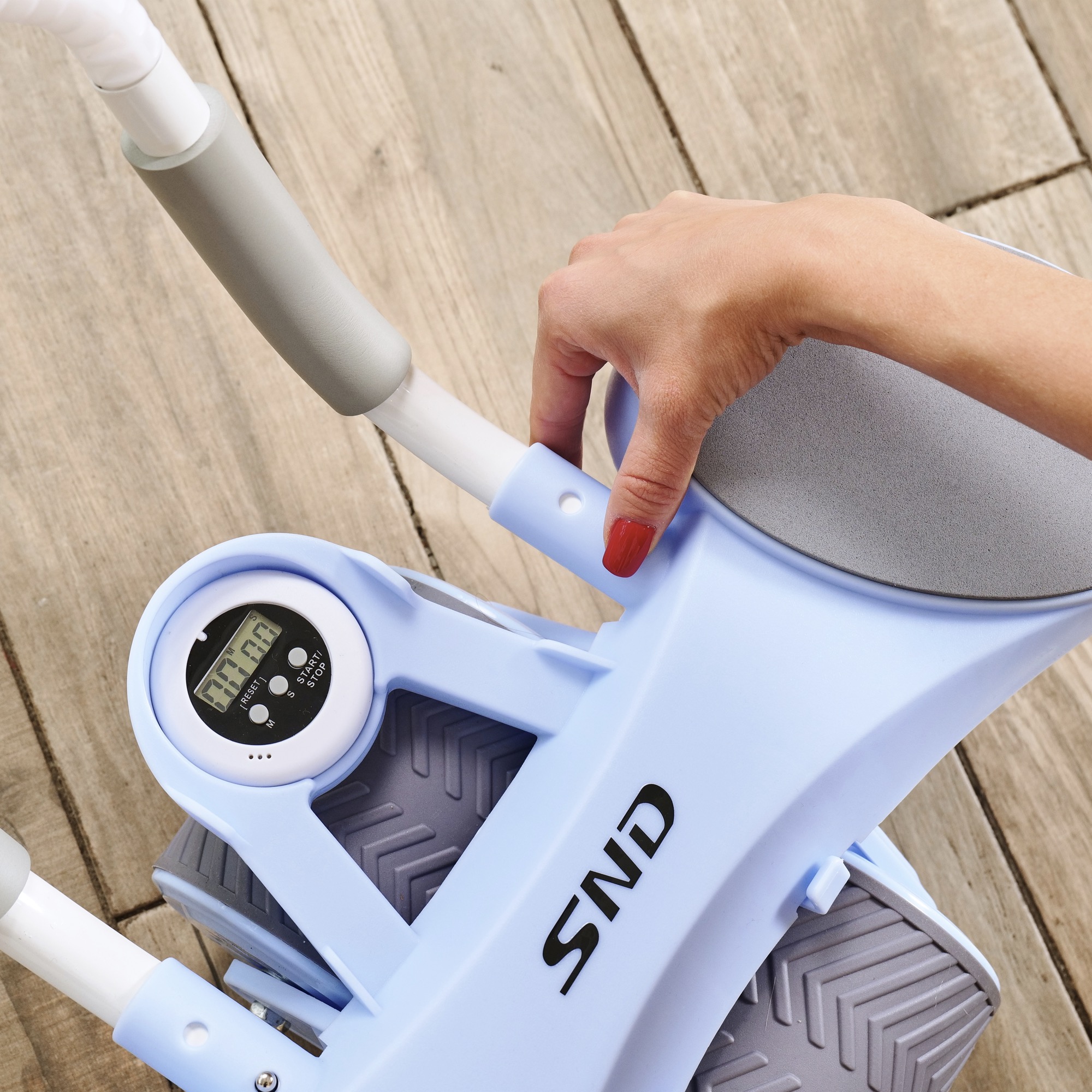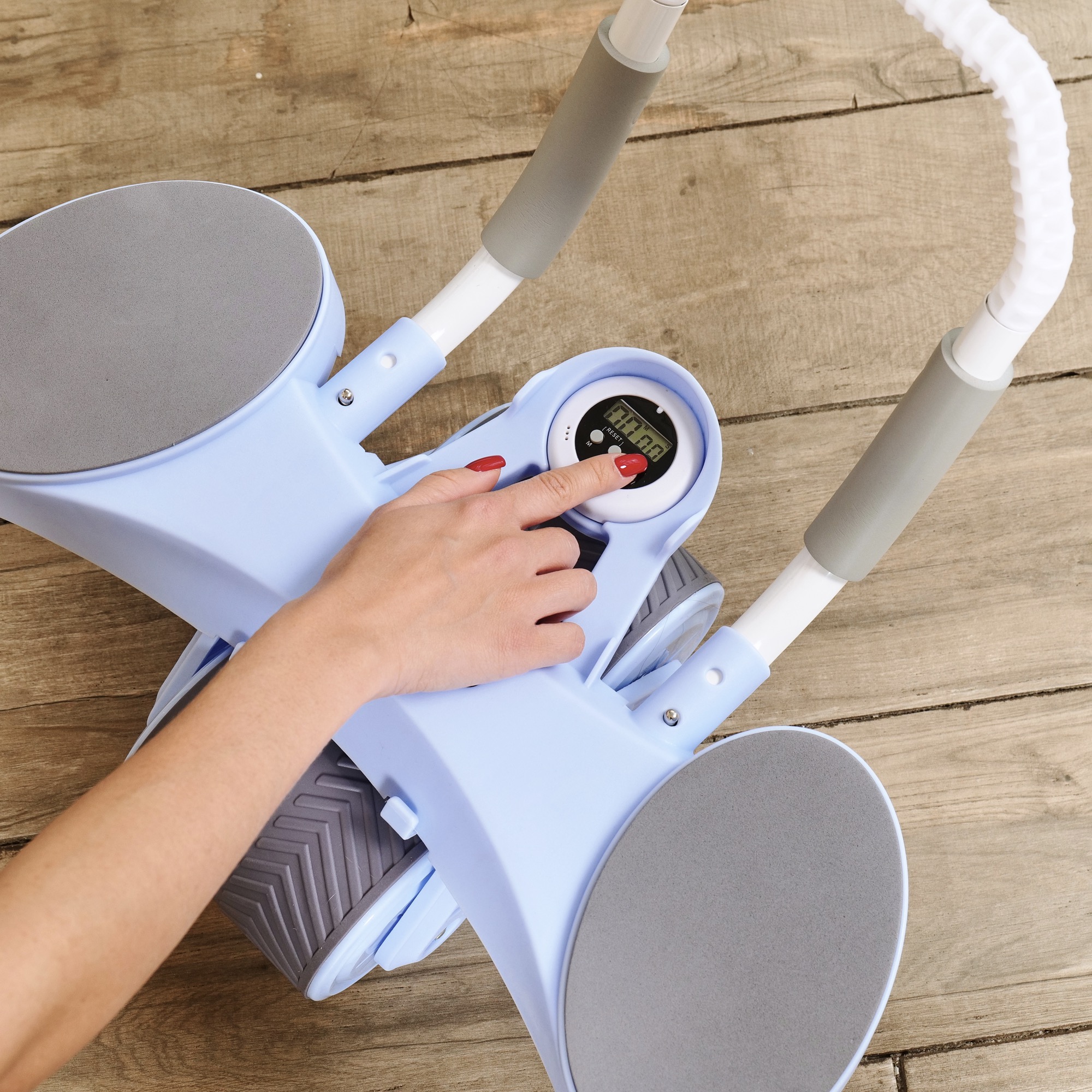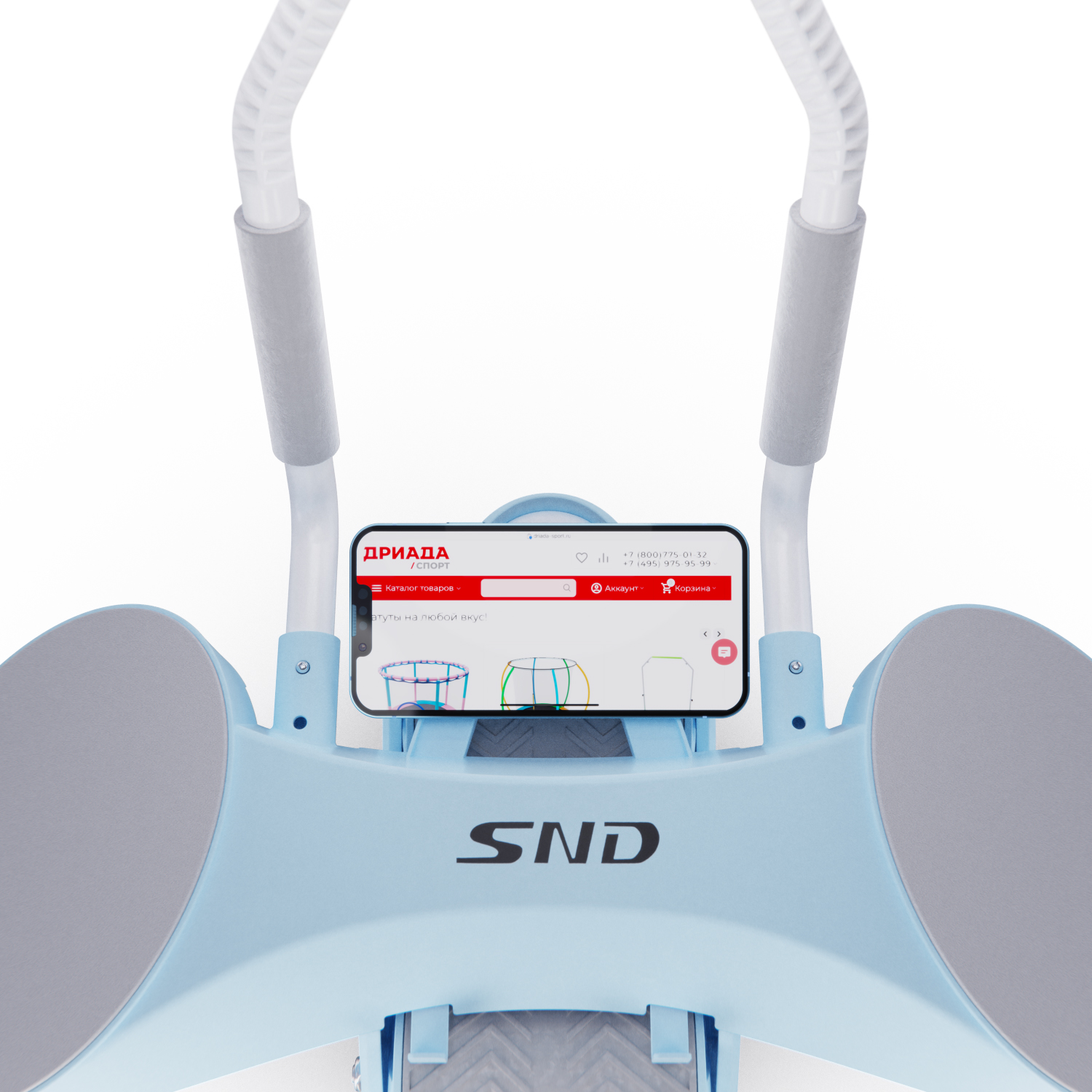 Монохромный LCD-дисплей диаметром 6,5 см отображает время тренировки. Дисплей работает от батарейки LR1130, не входит в комплект. Между подлокотниками располагается подставка под смартфон: разнообразьте свои тренировки просмотром фильма или подкаста.
