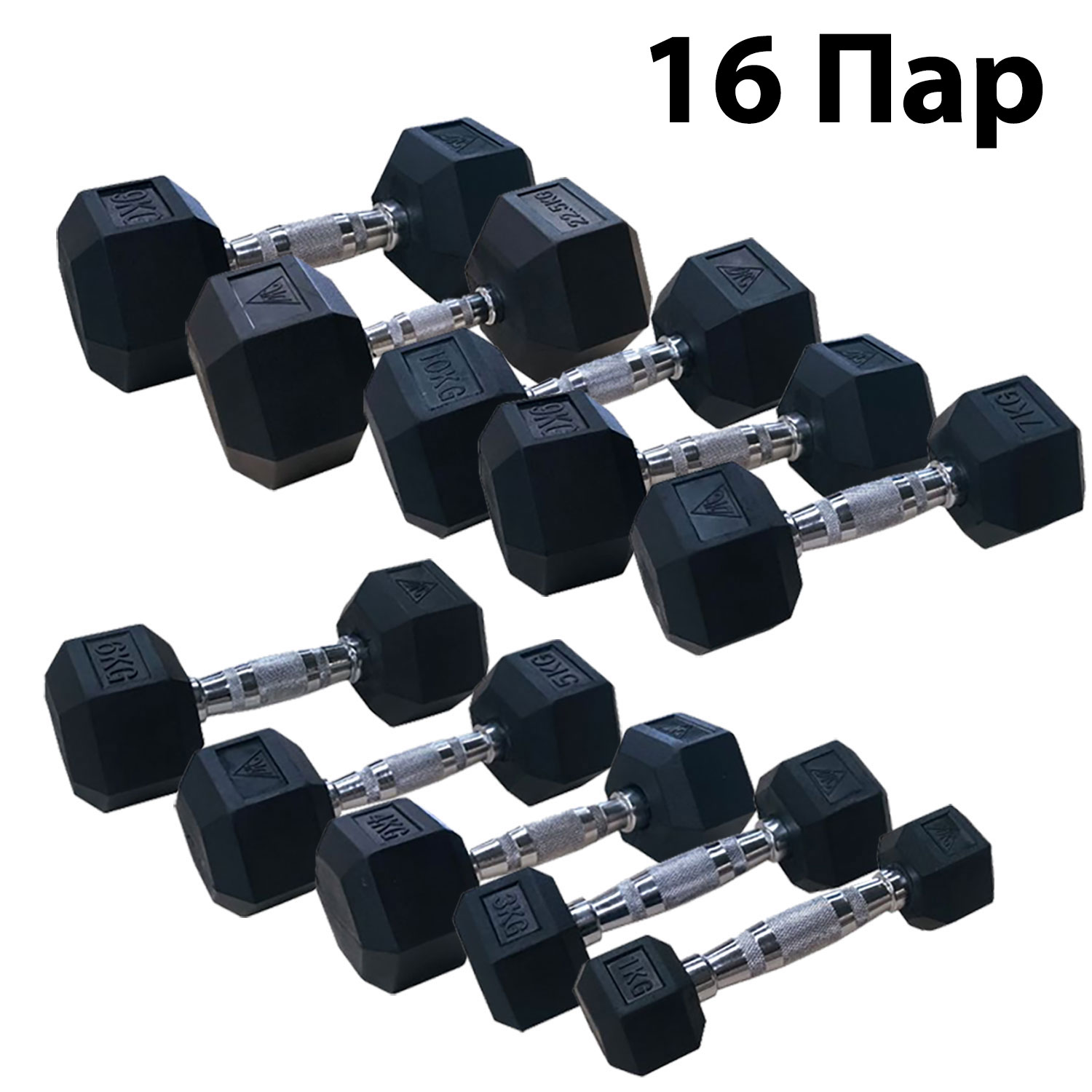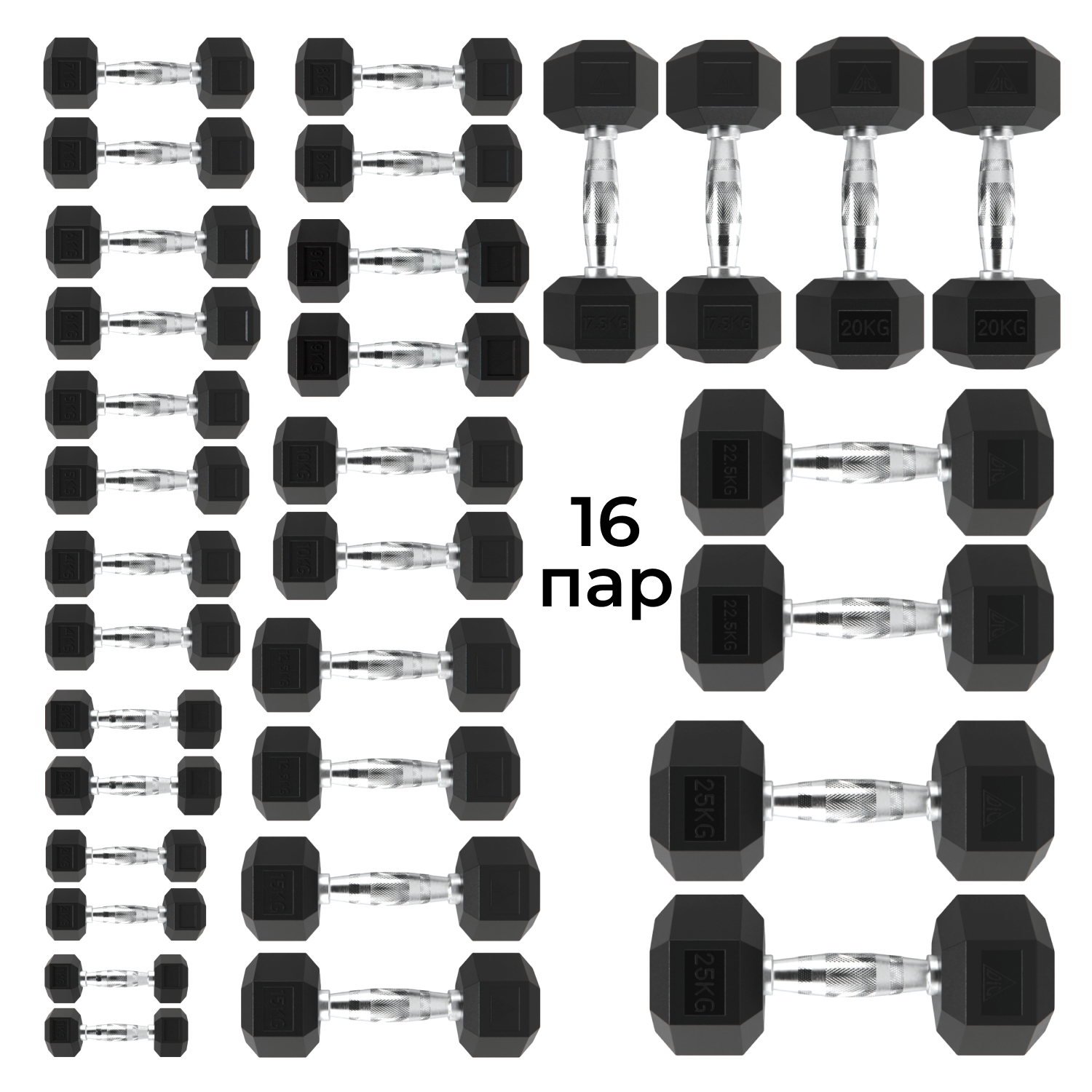 Набор включает следующие гантели: 2 x 1 кг, 2 x 2 кг, 2 x 3 кг, 2 x 4 кг, 2 x 5 кг, 2 x 6 кг, 2 x 7 кг, 2 x 8 кг, 2 x 9 кг, 2 x 10 кг, 2 x 12,5 кг, 2 x 15 кг, 2 x 17,5 кг, 2 x 20 кг, 2 x 22,5 кг, 2 x 25 кг