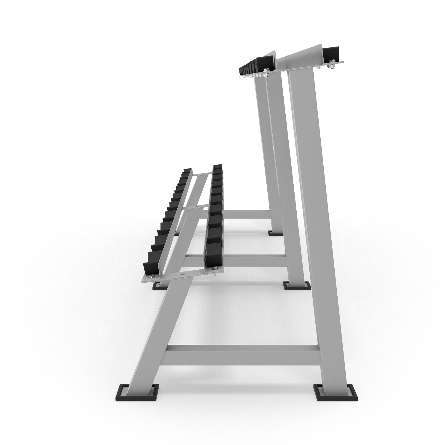 Стойка выдерживает нагрузку до 500 кг, на ней можно хранить до 10 пар гантелей весом от 12,5 до 50 кг . Все элементы выполнены из стали повышенной прочности.