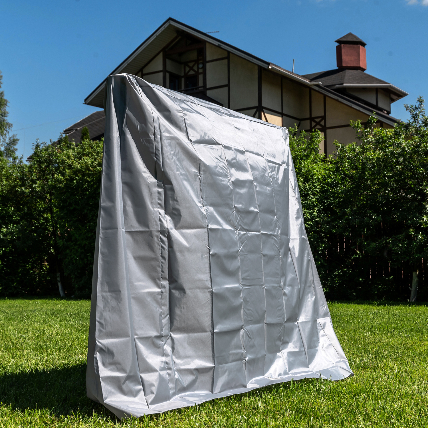 Чехол для теннисного стола серого цвета компакт-сборки: предназначен для накрывания сложенного стола. Сшит из ткани Oxford-210, плотность: 82 грамма на 1 м2.