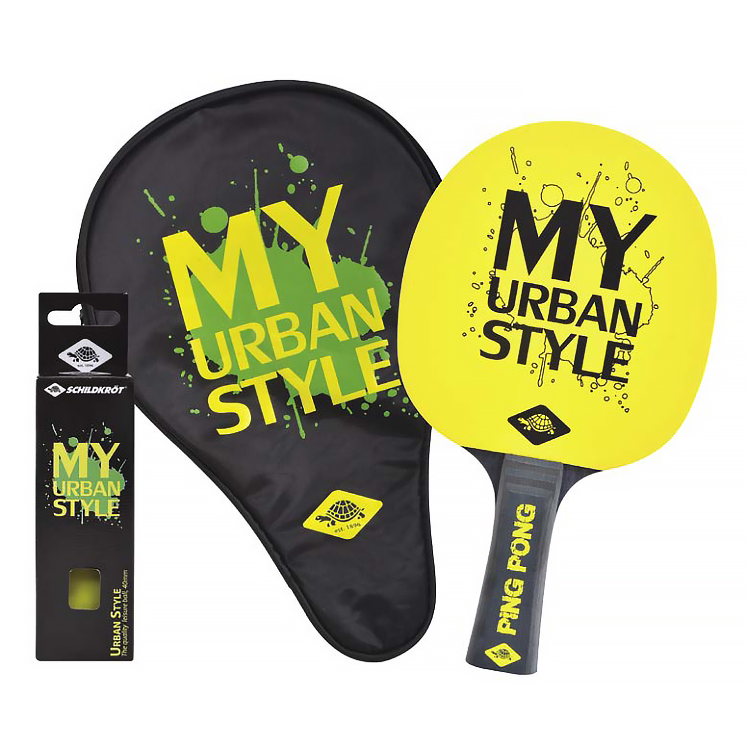 Набор DONIC Schildkrot URBAN SET: 1 ракетка для типа игры Control, 4 жёлтых мяча. Для покрытия ракетки используется чёрно-жёлтая накладка из каучука, а толщина губки 1,2 мм. Форма ручки Concave - ручка, расширяющаяся к концу.