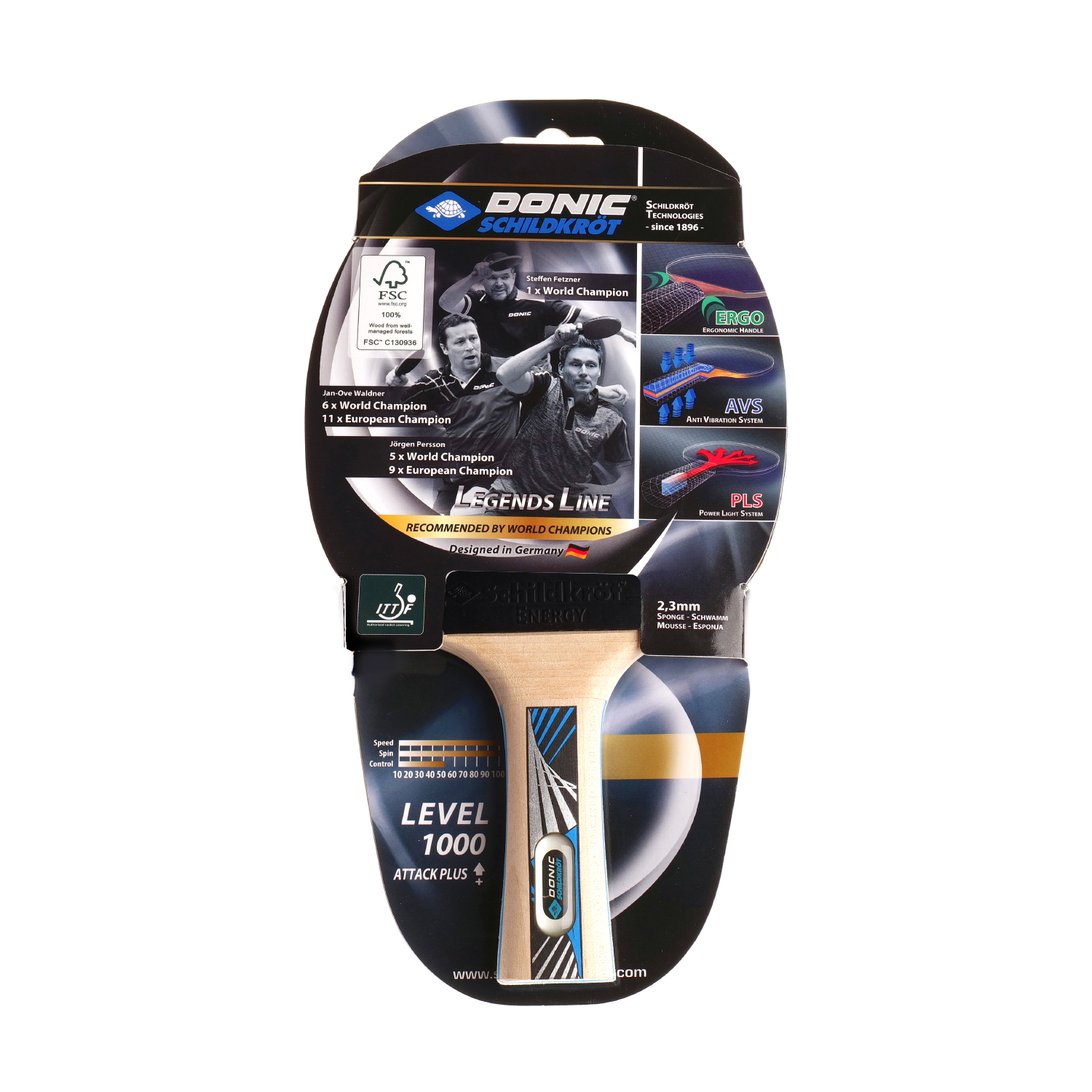 Ракетка DONIC "LEGENDS 1000" рассчитана на тип игры Атака+. Для покрытия используется накладка Energy, а толщина губки 2,3 мм. Форма ручки Concave - ручка, расширяющаяся к концу. Ракетка одобрена Международной федерацией настольного тенниса ITTF.