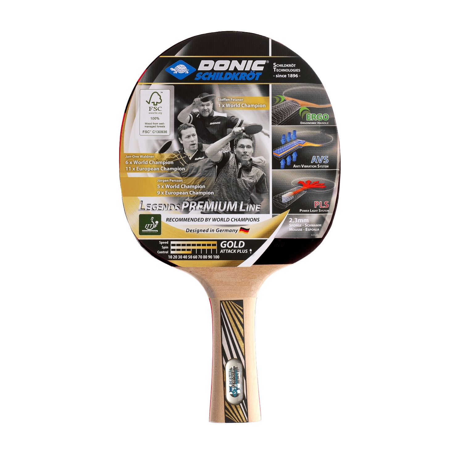 Ракетка "LEGENDS GOLD" из премиальной линейки DONIC рассчитана на тип игры Атака+. В комплекте с LEGENDS GOLD идёт чехол по форме ракетки. Для покрытия используется накладка Energy, а толщина губки 2,3 мм. Форма ручки Concave - ручка, расширяющаяся к концу. Ракетка одобрена Международной федерацией настольного тенниса ITTF.