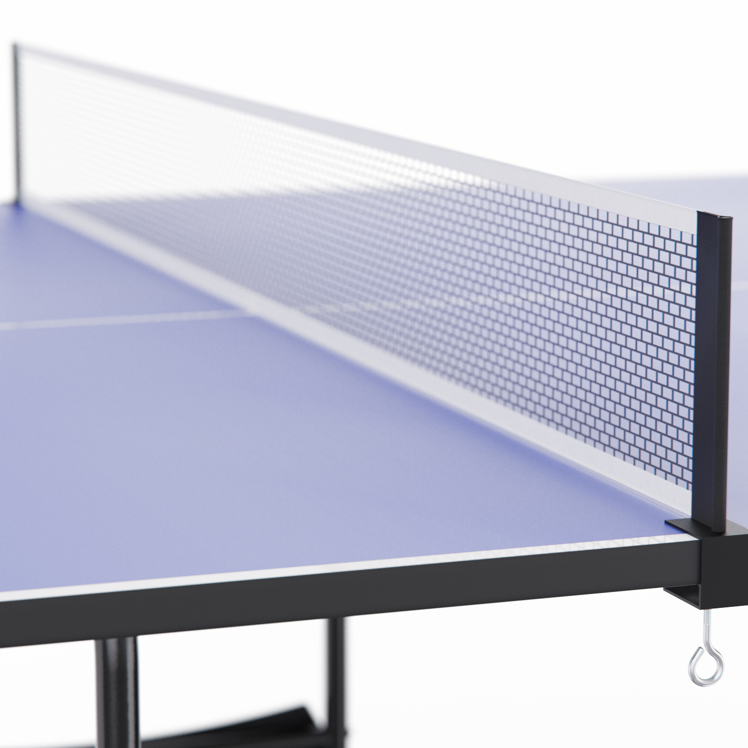 Столешница выполнена прочных металлических элементов с ножками диаметром 25 мм, что гарантирует устойчивость и безопасность в процессе игры. Такая конструкция выдерживает интенсивные нагрузки и подходит для регулярного использования. Толщина столешницы 15 мм, что обеспечивает хороший и предсказуемый отскок мяча. Синий цвет поверхности выглядит ярко и стильно, а защитный кант по периметру предохраняет края столешницы от повреждений и продлевает срок службы.