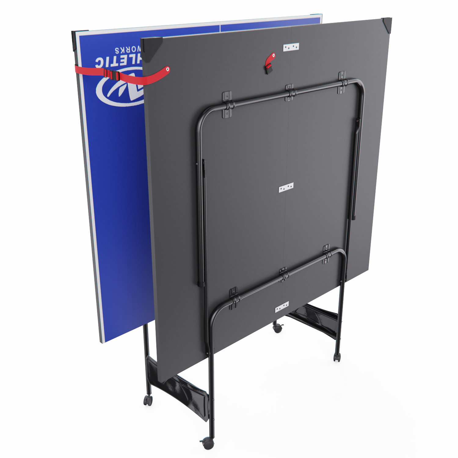 Конструкция стола состоит из 4-х частей, при этом стол складывается наполовину, что позволяет играть в одиночку и экономит место при хранении. В сложенном виде он занимает минимум места, что делает хранение и транспортировку максимально удобными. Для удобства перемещения стол оснащён четырьмя транспортировочными роликами с фиксаторами. Это позволяет легко перемещать его по дому или площадке и надёжно фиксировать в нужном положении.