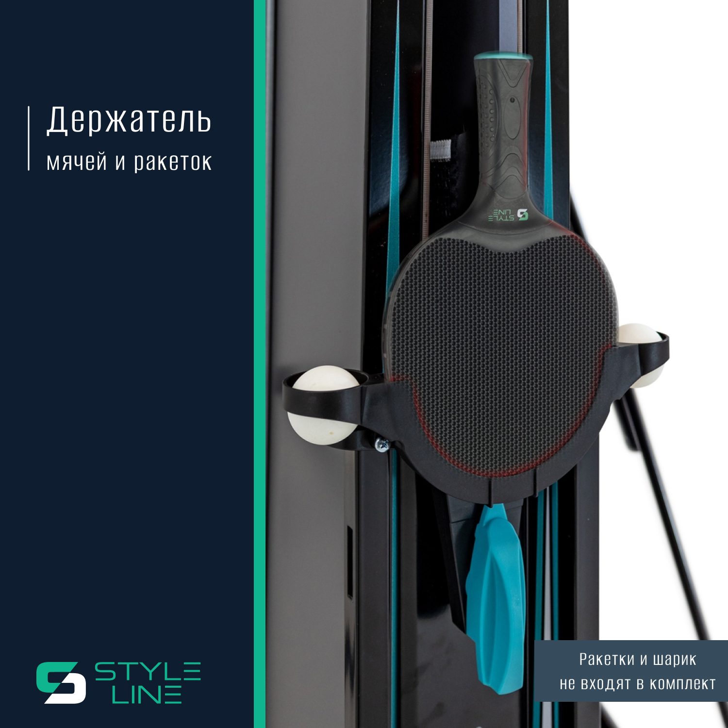 В комплекте со столом идет сетка для настольного тенниса и держатель для ракеток и шариков. Безопасность игры обеспечивается благодаря системе защиты от опрокидывания со специальным поворотным механизмом и защелкой.