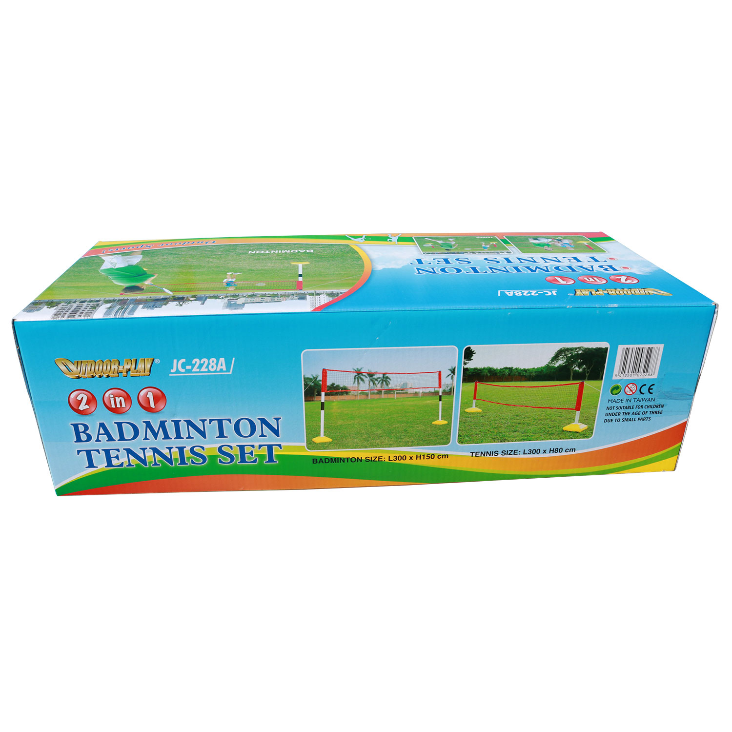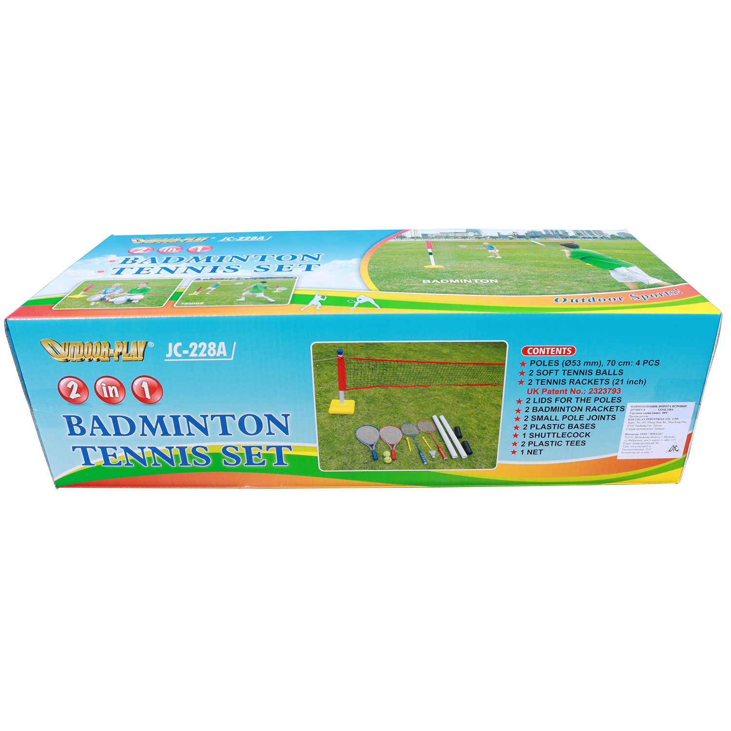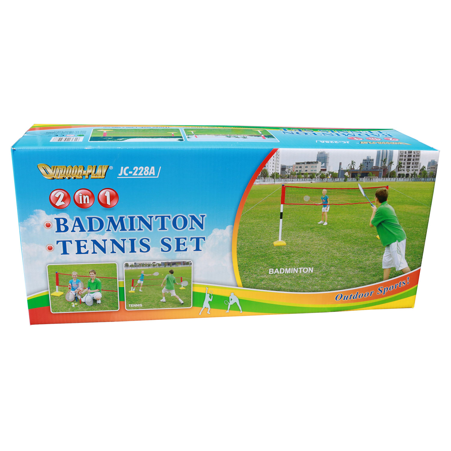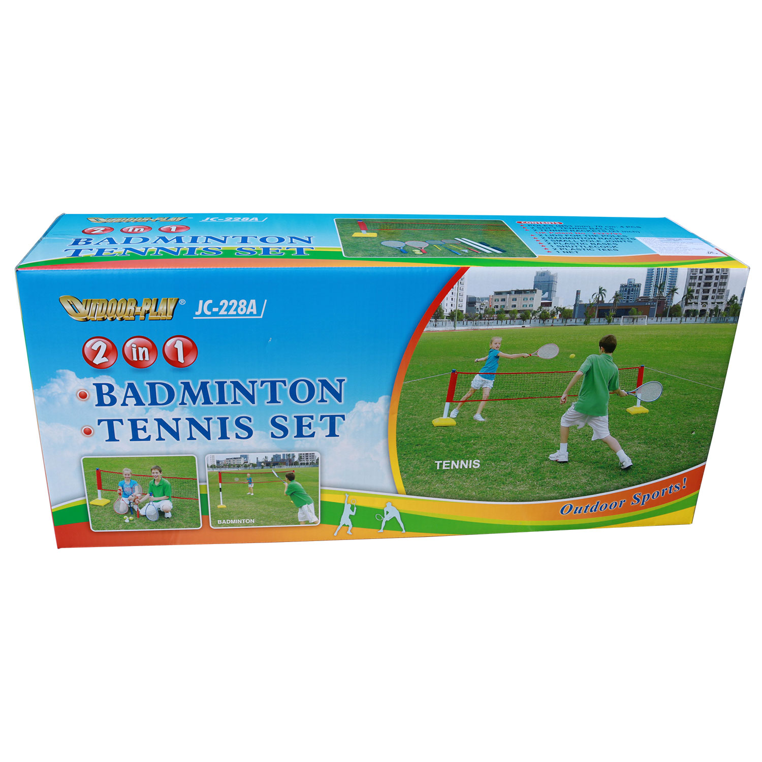 Комплект для игр на природе. В комплекте складная сетка, которую можно настроить для игры в теннис, бадминтон. Это возможно благодаря возможности изменить высоту сетки. В качестве утяжелителя используются ёмкости, в которые нужно налить воду. Также в комплекте идёт 2 ракетки для тенниса, два мячика для тенниса, два ракетки для бадминтона и воланчик к ним.